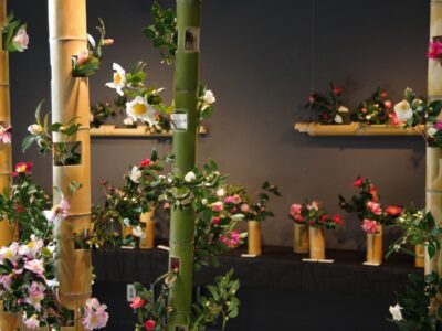 展示室を彩る華麗で多様なツバキの花々をお楽しみください。